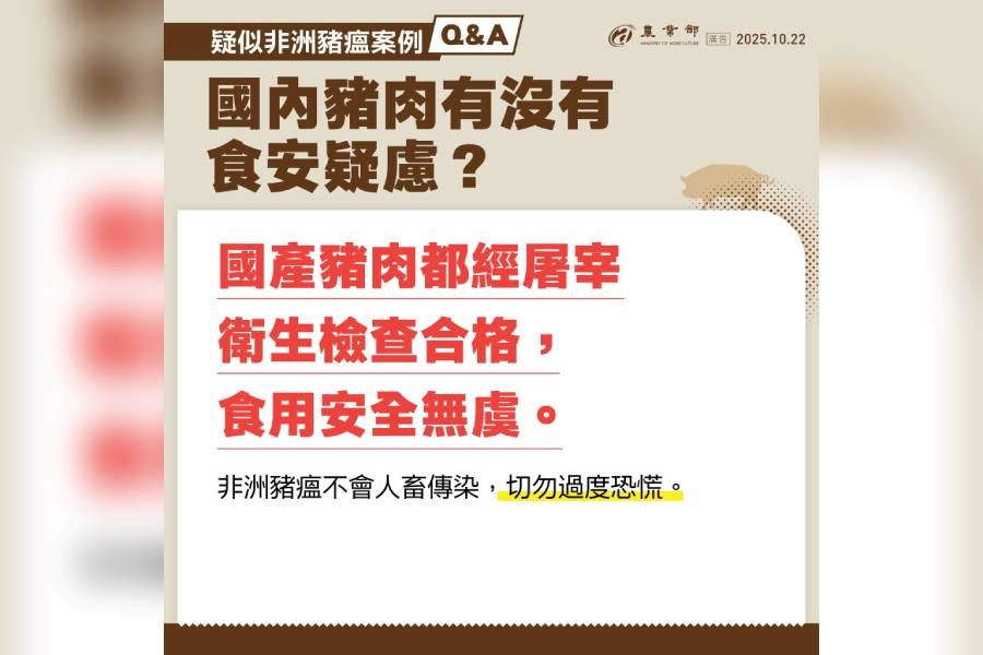 台中爆出疑似「非洲豬瘟」案例,農業部22日召開記者會表示,台中梧棲區1養豬場死亡豬隻之檢體,驗出非洲豬瘟病毒核酸陽性反應, 農業部隨即前往臺中成立前進應變所,全面防堵疫情擴散,農業部臉書上也彙整5大Q&A,讓國人了解非洲豬瘟及疫情、市場供應情形。