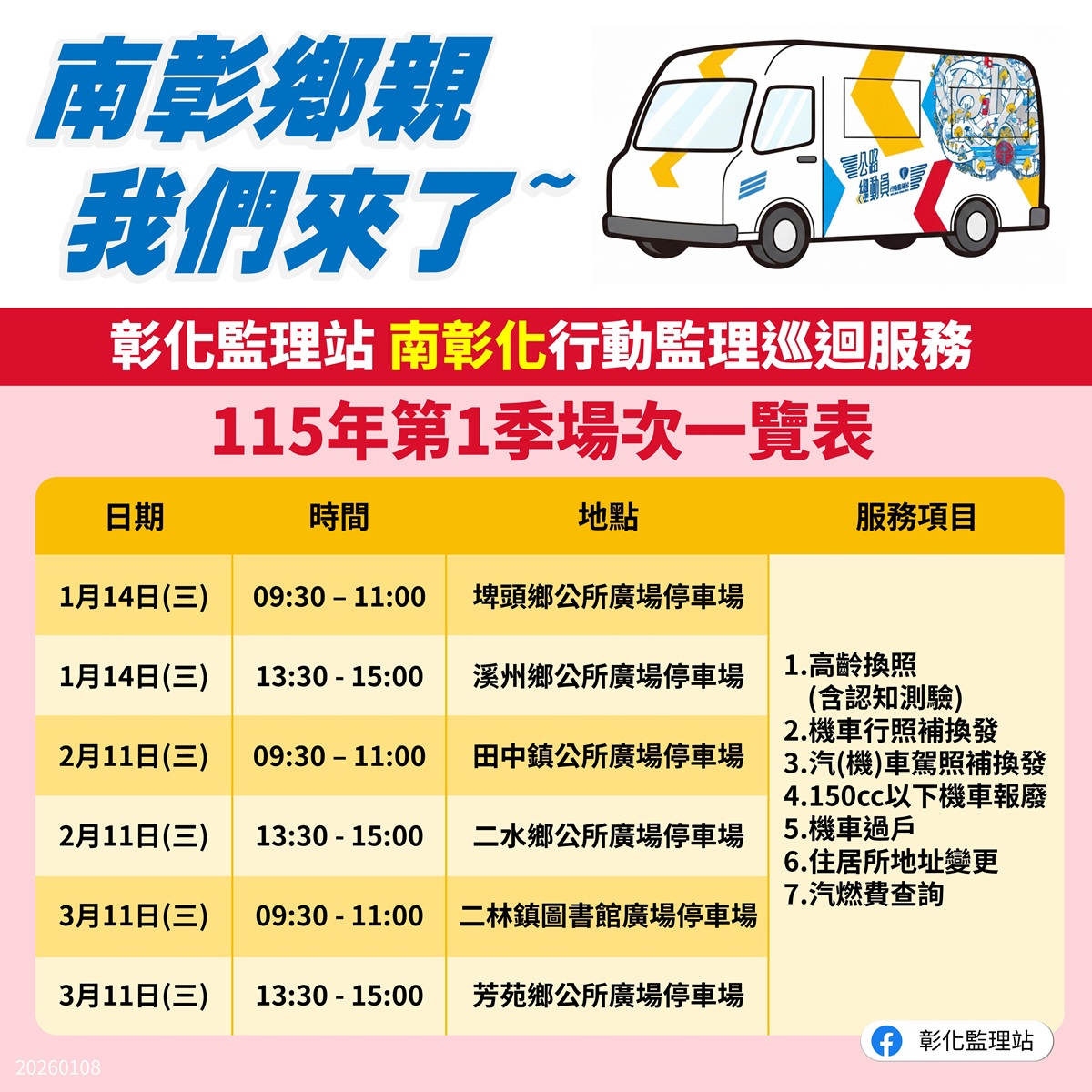 迎接新的一年,彰化監理站服務熱忱「馬力十足」!為落實「監理到點、服務到家」理念,監理站將於 115 年起規劃多場下鄉服務。考量南彰化部分鄉鎮距離監理站有一定距離,為免除鄉親長途奔波之苦,特別安排「行動監理服務專車」深入基層,將便利的監理窗口直接送達鄉公所門口,讓大家在馬年便能享受便捷服務,「馬」上辦、「馬」上好!